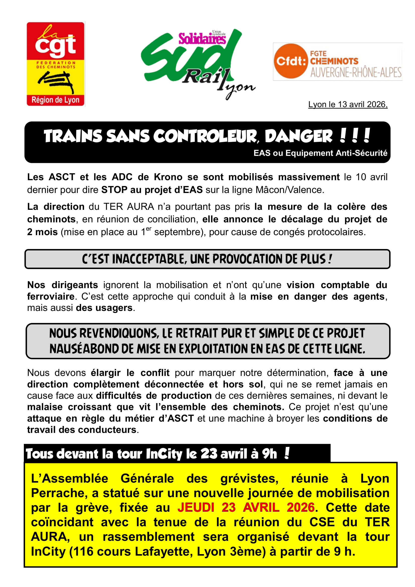 Tract Unitaire TRAINS SANS CONTROLEUR, DANGER !!! EAS ou Equipement Anti-Sécurité Parsudraillyon 17 avril 2026